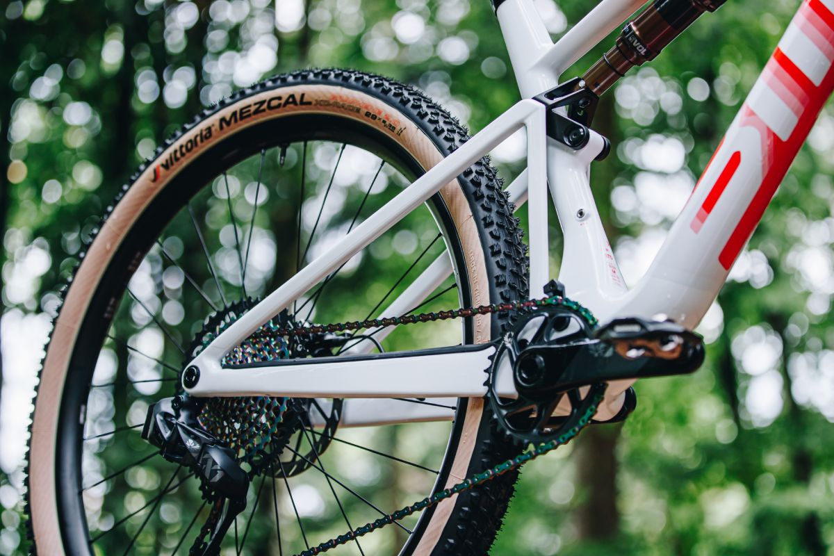Les roues : commencez par une inspection visuelle des rayons (un rayon cassé ou détendu se repère facilement) et de l’état des jantes (impacts, fissures sur carbone, déformation visible). Faites ensuite tourner chaque roue librement : un voile marqué suggère une chute potentielle et nécessitera un dévoilage en atelier, un bruit de grattage au niveau du moyeu signale des roulements à remplacer. L’état des pneumatiques est secondaire, ils sont à adapter à votre pratique et peuvent se changer facilement. En revanche, vérifiez la compatibilité tubeless des jantes : un montage sans chambre à air est aujourd’hui la norme sur un VTT moderne.